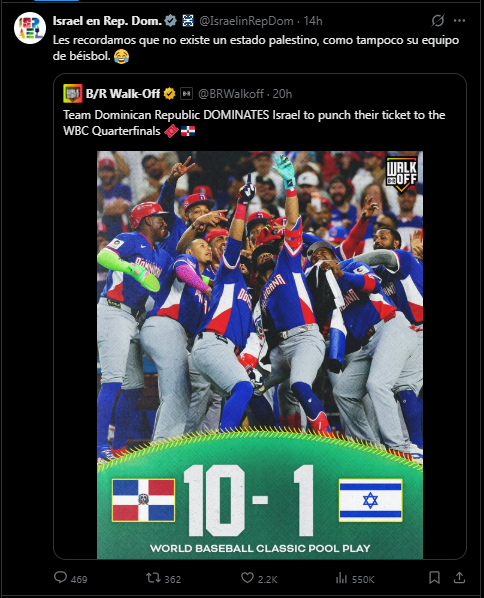 Sin embargo esta publicación no pasaría desapercibida ante los ojos de Israel, quien atacó inmediatamente desde la cuenta oficial de su embajada en República Dominicana con el mensaje “Les recordamos que no existe un estado palestino, como tampoco su equipo de béisbol. 😂”.