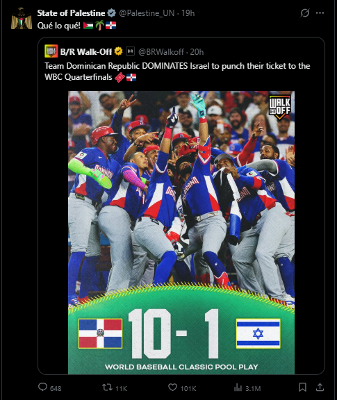 Tras una avasallante victoria 10 carrera por 1 de la novena dominicana sobre la representación israelí la cuenta oficial de X (Twitter) de la misión en las Naciones Unidas (ONU) del Estado de Palestina (@Palestine_UN) realizó una publicación celebrando el resultado de la victoria de República Dominicana con la característica frase “Qué lo qué! 🇵🇸🌴🇩🇴”.